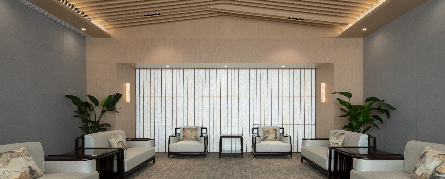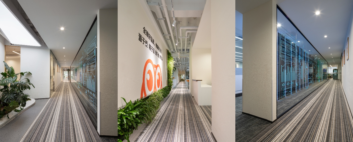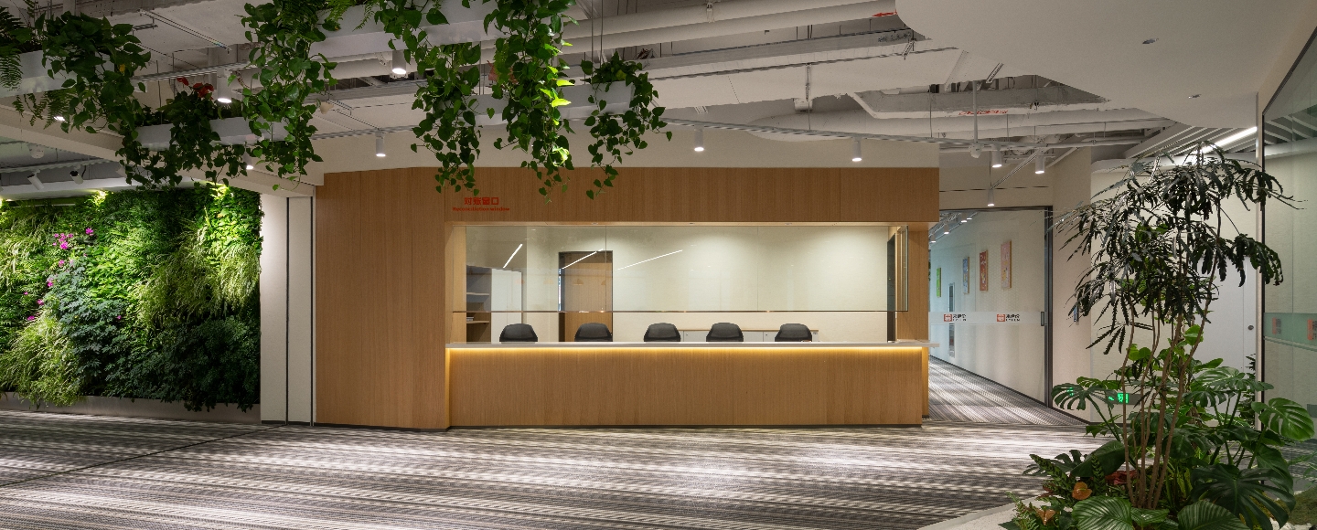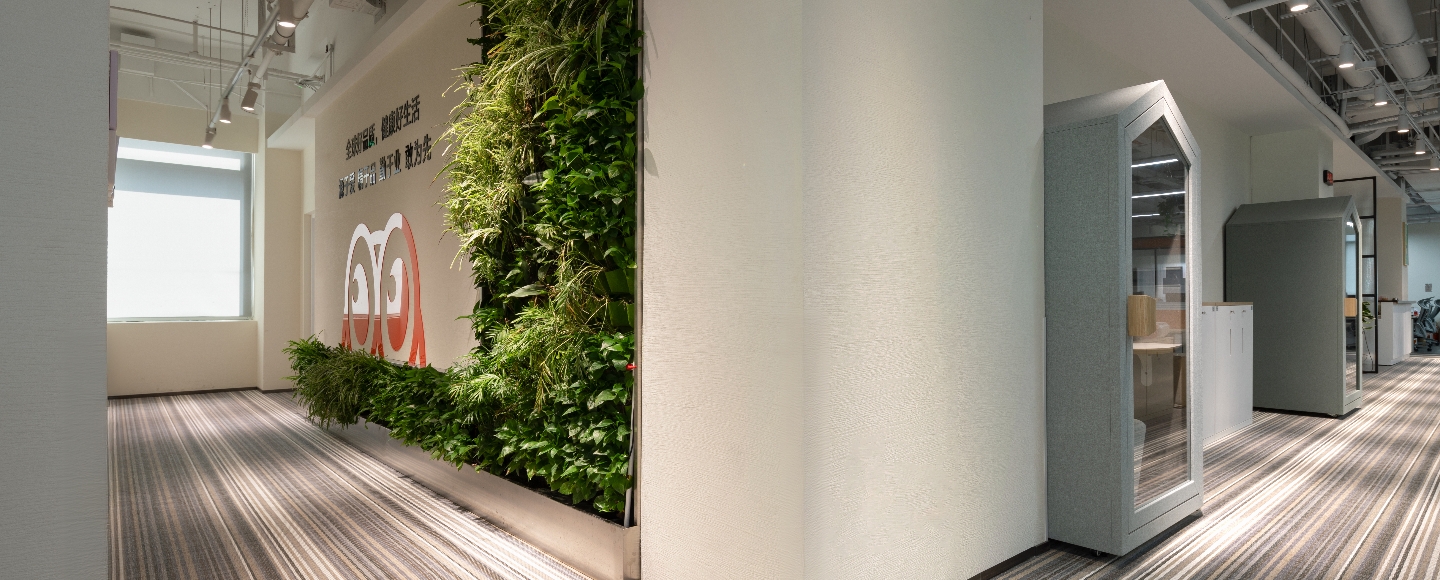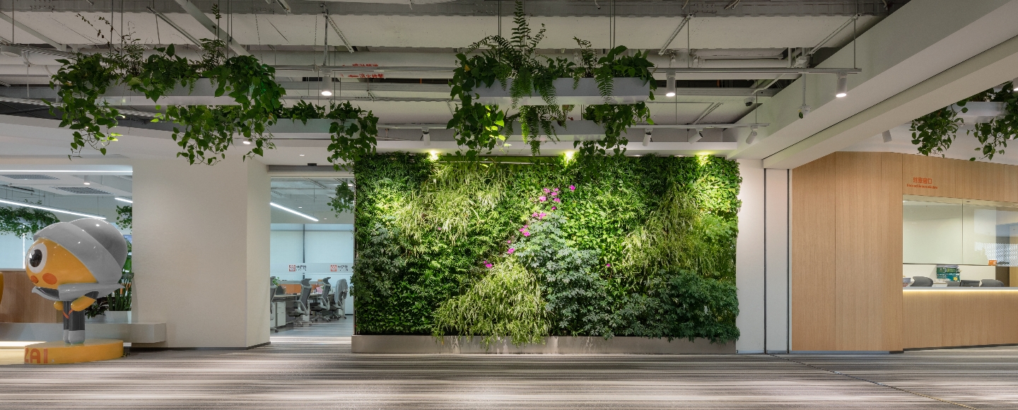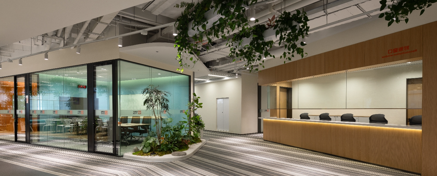 该乐园涵盖接待大厅、社交中心、会议培训中心、运营中心、总裁办公室、企业会所及 8 个常规办公区,每个功能区均以垂直绿植、可循环环保材料、节能照明系统,模块化家具等为基底,勾勒出森系空间的松弛感。